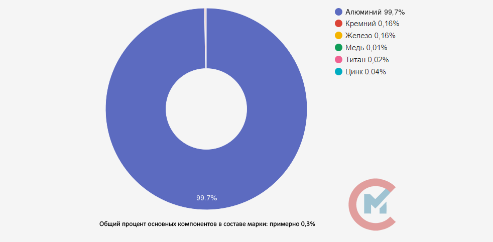 А7 — популярный сплав из первичного алюминия. Буква А означает основной компонент — алюминий. Цифра 7 обозначает процент содержания алюминия в долях после запятой (99,7%).